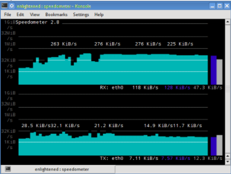 The speedometer displays a clean and clear graph displaying the Linux network traffic flowing in and out through all the system’s network interfaces.