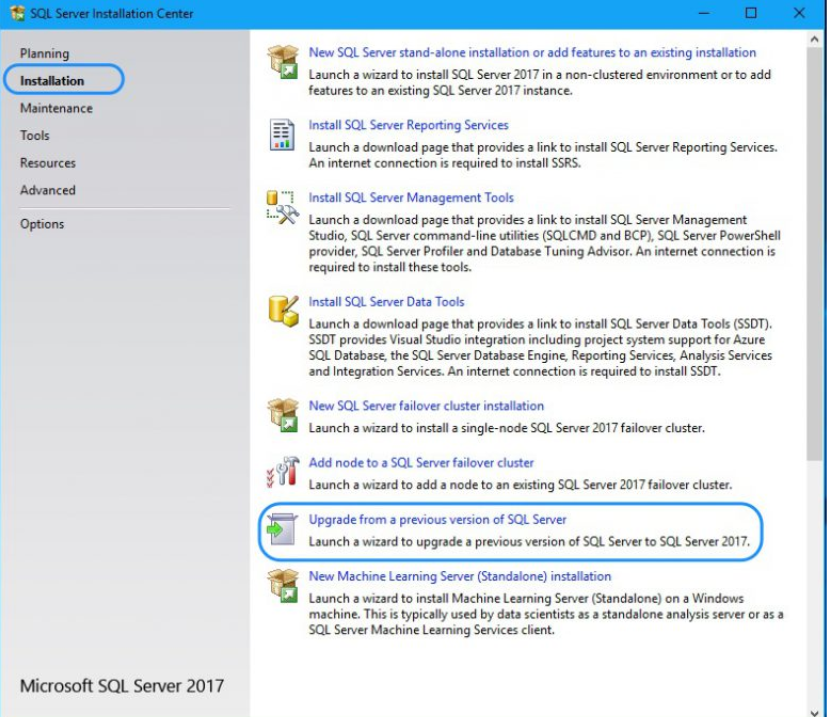- You will get a screen for ‘Upgrade to SQL Server 2017’. You can select the preferred option and go through the upgrade process.