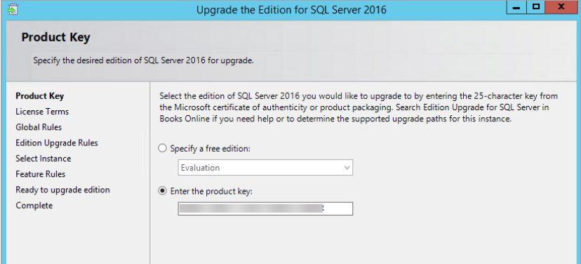 - You will be the Upgrade edition wizard for specifying the product key of the SQL standard edition available to you.