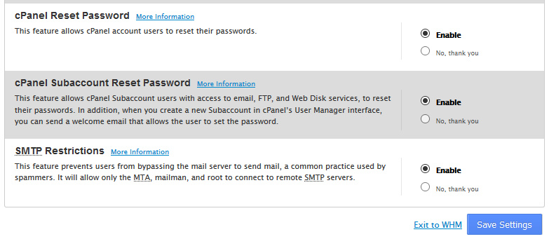 Next, you will see cPHulk's username-based protection feature, which only blocks a certain user instead of blocking the IP address so that other users may log in from the same IP. There are more new features like PHP-FPM, ModSecurity, cPanel Reset Password and more. You can choose to enable them or disable them by selecting the No, thank you option.