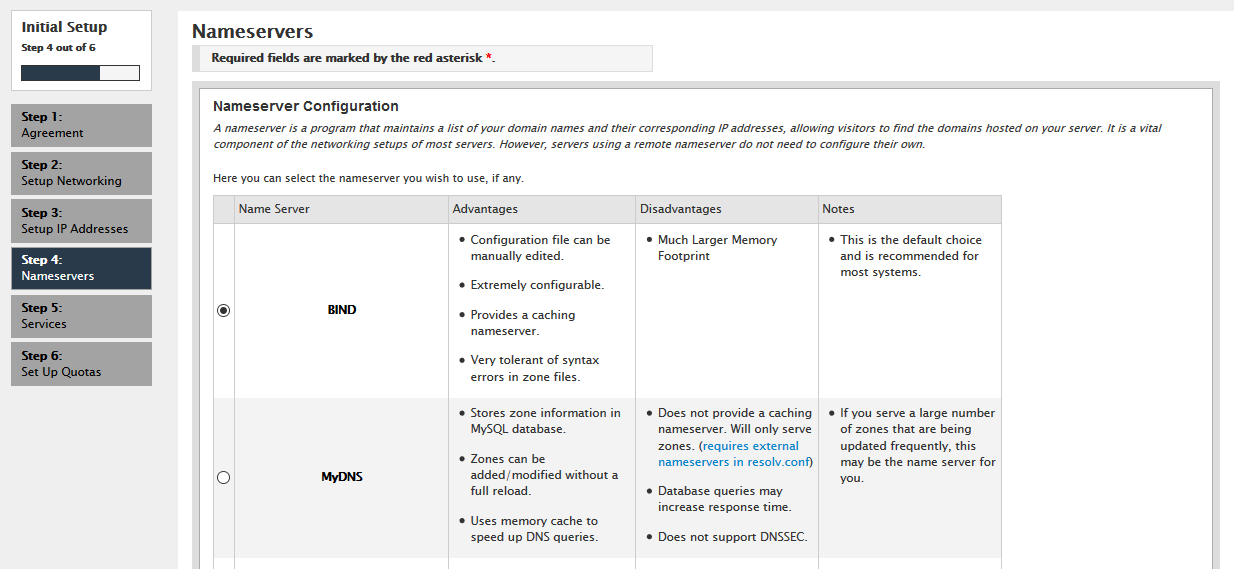 In Step 4, you will be taken to the Nameserver configuration. You will have three options to choose from; you can compare the advantage and disadvantages of using different Name server applications. Recommended is that you select BIND as it has the most benefits.