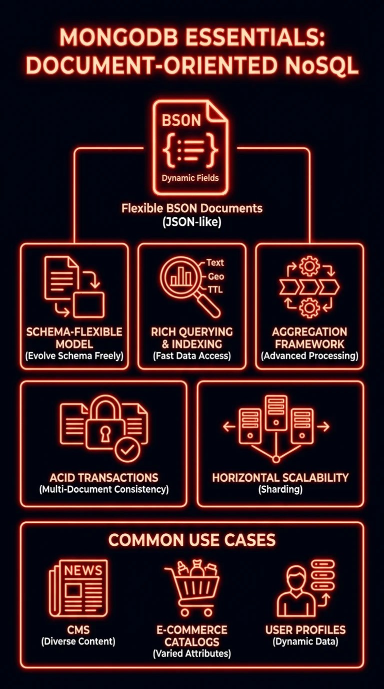 MongoDB is a document-oriented NoSQL database that stores data in flexible, JSON-like BSON documents.